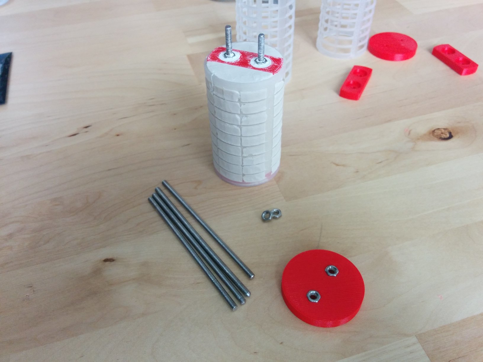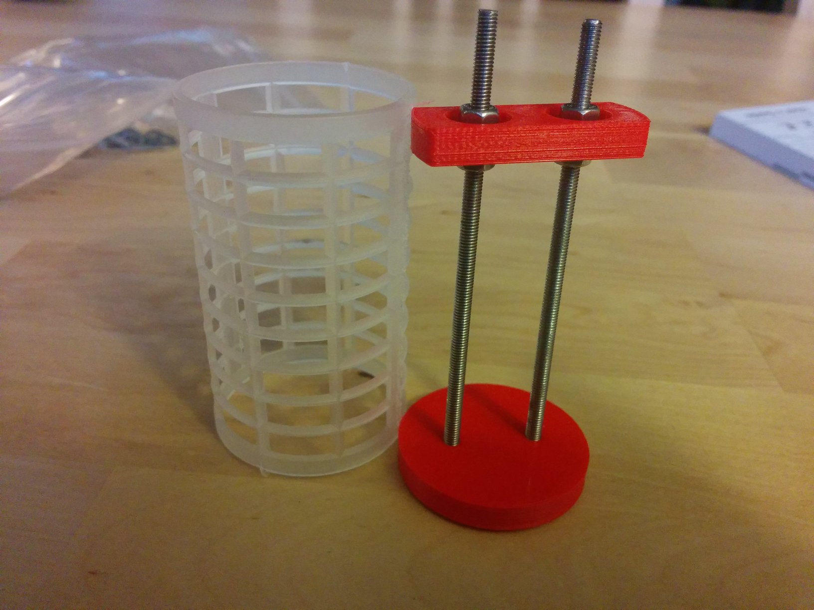 Assembled 3d printed components and stainless steel studding next to a 35 mm hair curler.