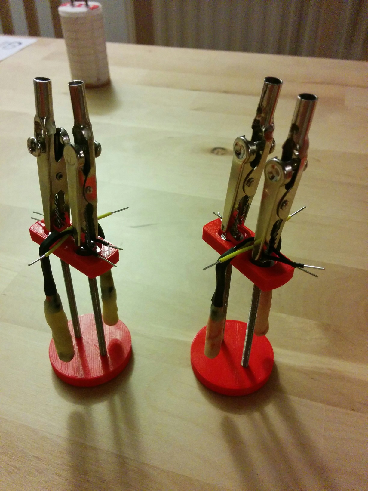 Holding temperature sensors in place with croccodile clips ready for casting in plaster of Paris.