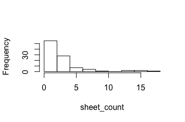 In our sample of spreadsheets (100) we see that a spreadsheet can have a number of sheets associated with it. We use purrr to apply a function element-wise to a list. We then unlist and count the number of sheets per workbook and plot as a histogram.