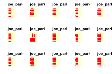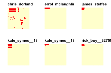paste("There are ", length(w), "worksheets in this range.")## [1] 80 81 82 83 84 85 86 87 88 89 90 91 92 93 94## [1] "There are 15 worksheets in this range."# Plot a few of them. red = value, beige = blank
